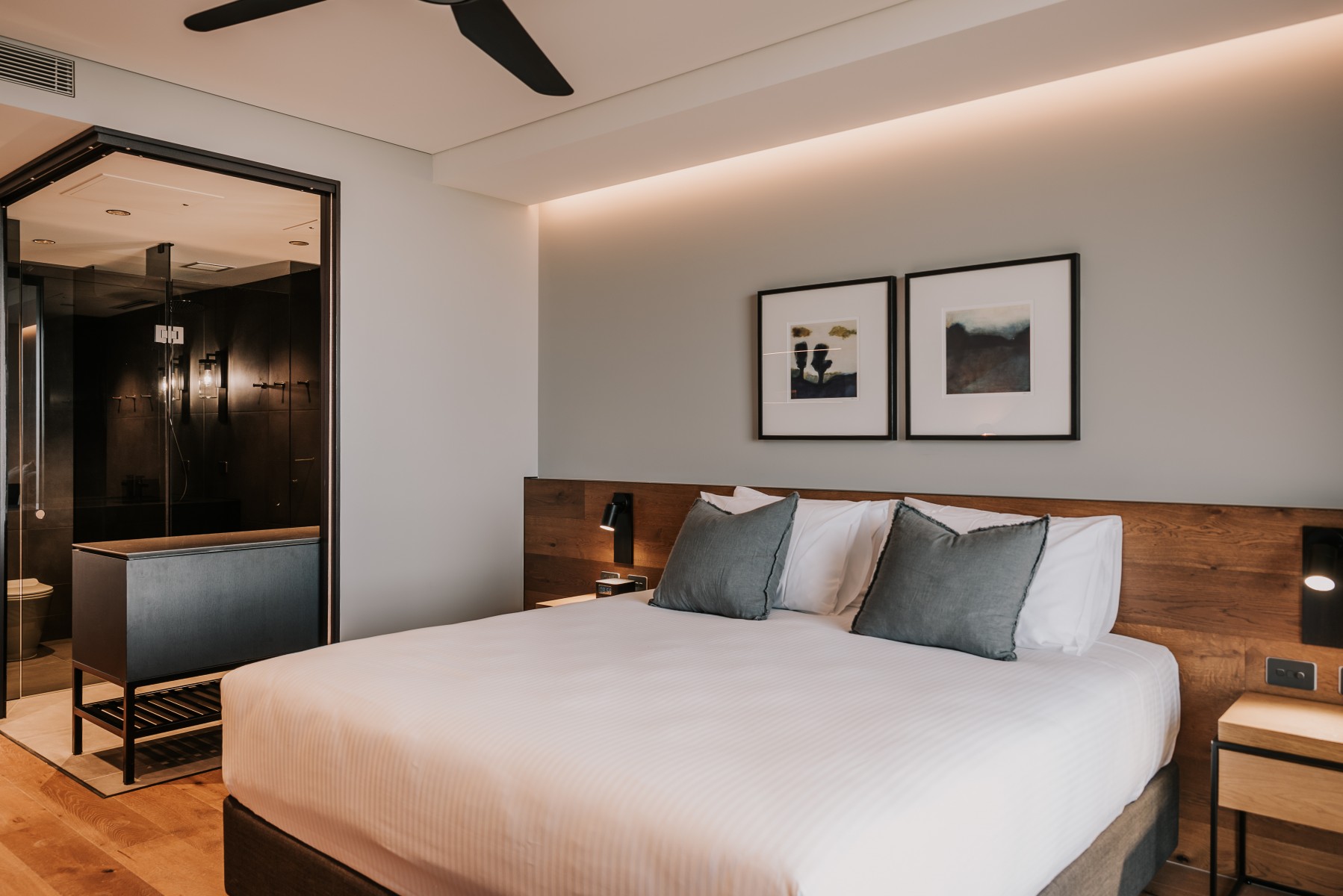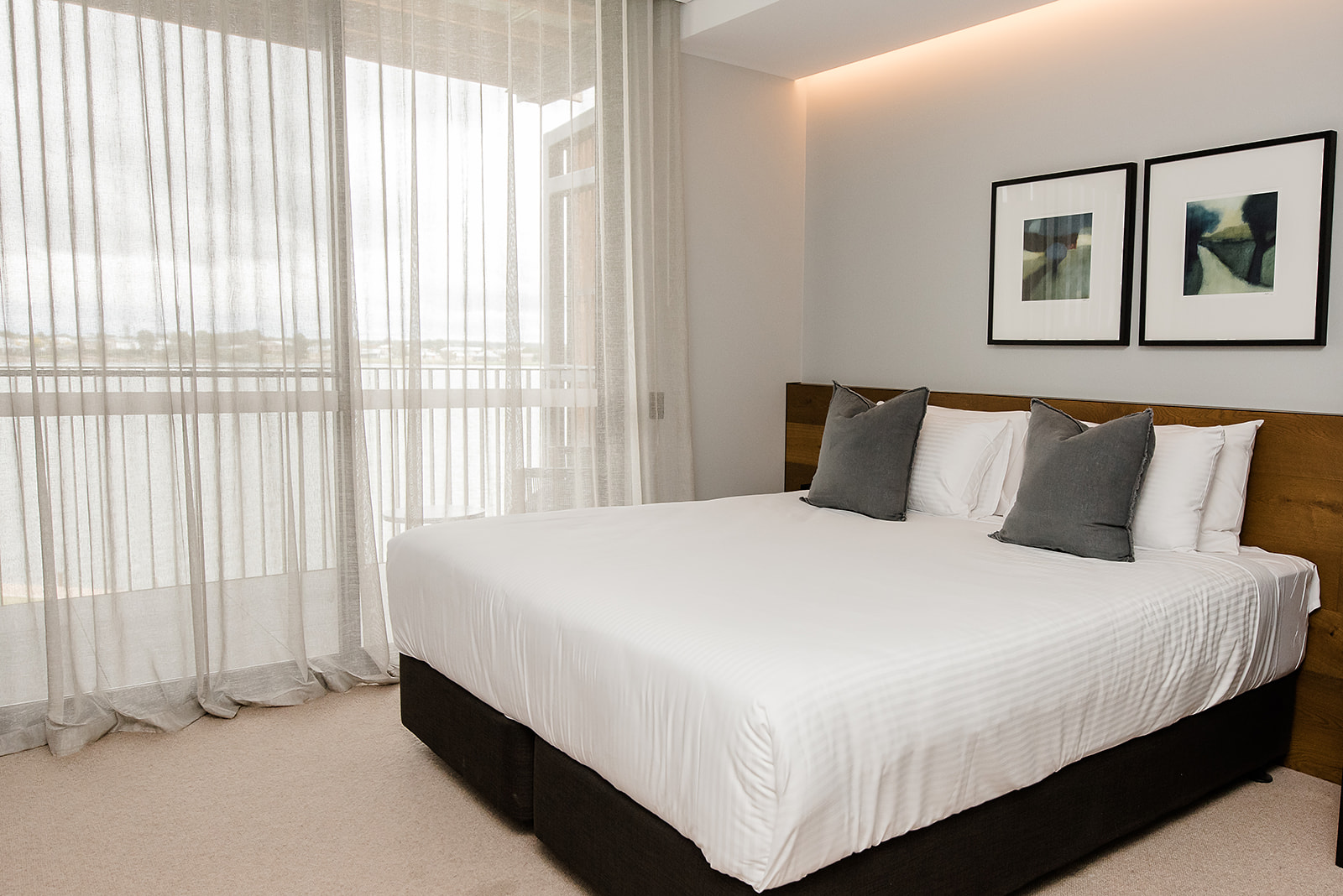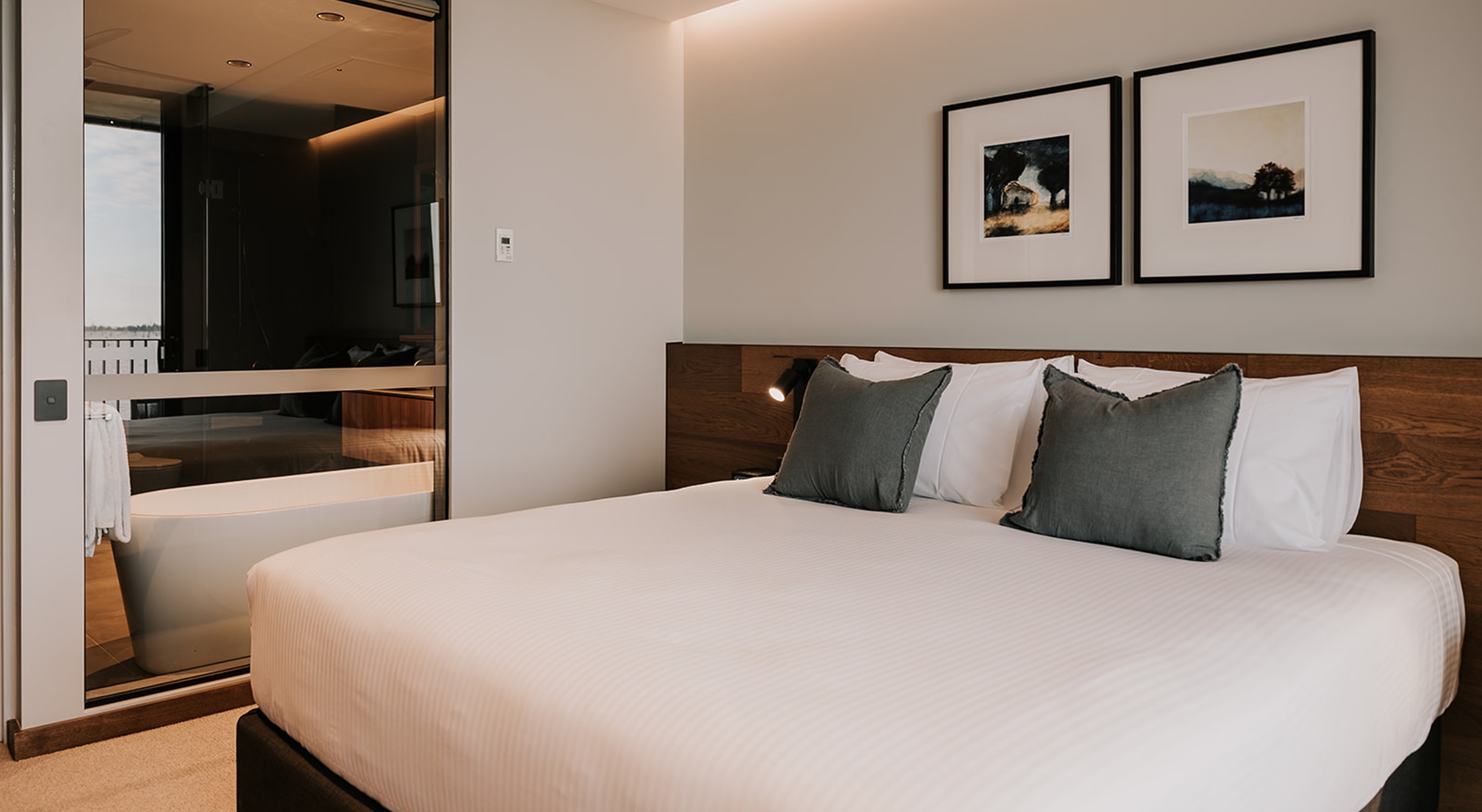 Luxurious One Bedroom Accessible Apartment featuring designer décor, separate lounge and king bedroom both with balcony access and uninterupted Lake Views. Eco style ensuite bathroom with a walk in shower.