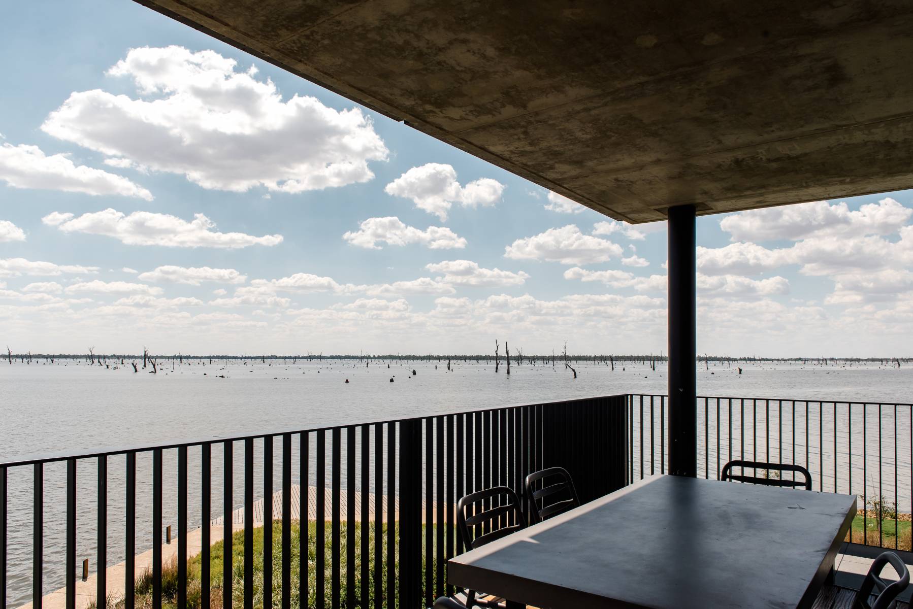 Stylish studio accessible room featuring upholstered king bed, furnished balcony with Lake Views, complimentary wifi and Foxtel, 49″ TV, minifridge, kettle, and walk in shower in bathroom