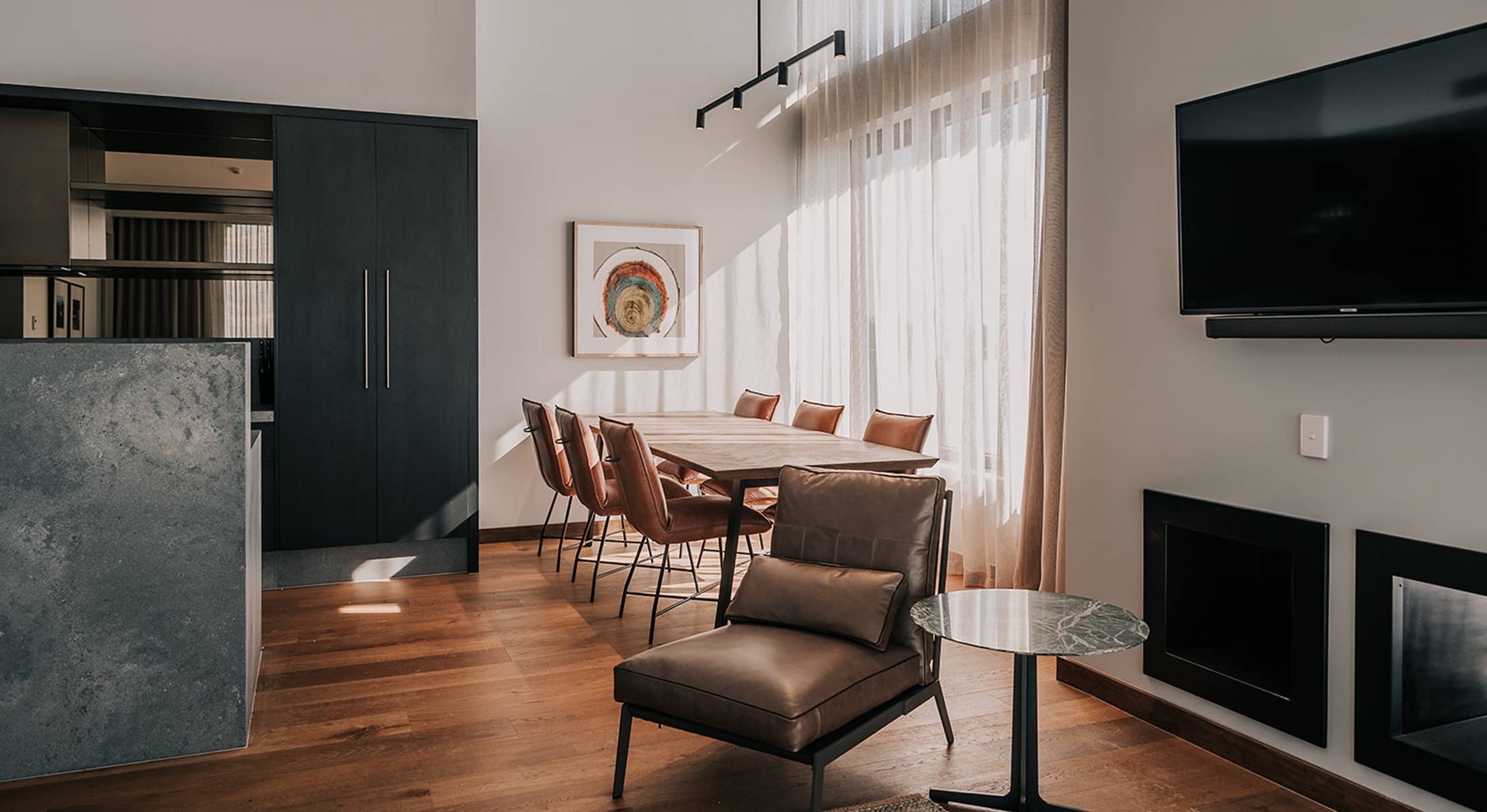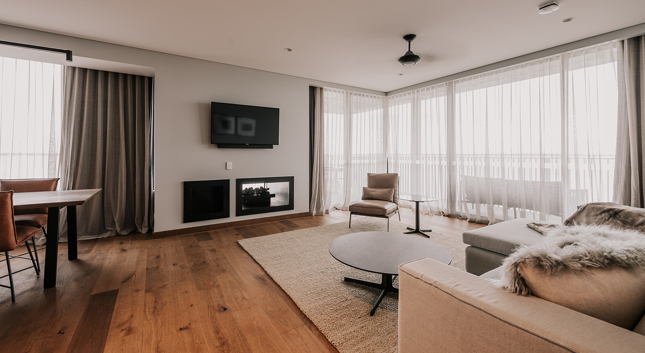 The Ultimate in Luxury, our 3 Bedroom apartment features Lake Front Views, designer décor with high ceilings, a large separate lounge room and 3 King Bedrooms, main with a separate balcony appointed on the 3rd floor. Complimentary Wi/Fi, 49” LCD digital televisions, Two Eco luxe bathrooms, one featuring a freestanding bath which enjoys lake views. Self cater in the beautifully equipped gourmet kitchen including stone island benchtop, oven & cooktop and full size integrated fridge, lavish parquet oak dining table seating 6 and European laundry with washer/dryer. Multi view fireplace which can be enjoyed indoors or on the furnished wrap around balcony.